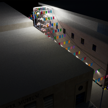 A steel structure supports cables that slope from the entrance gates to a center tower that's over 30' tall. Translucent panels adorn the cables and cast colored shadows along the alley during specific times of day. The experience changes at night when the tower glows from internal lights. The center tower hosts a rotating display by local Shelbyville artists celebrating the seasonality of Japanese celebrations.